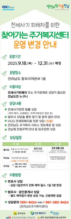 이에 전남도는 전세사기 피해자 접근성을 높이고 주거문제로 상담이 필요한 도민을 지원하기 위해 지난 4월부터 동부지역본부에 찾아가는 ‘주거복지센터-전세사기 피해상담’을 운영중이다.