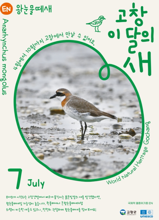 [무한뉴스=정민정 기자] 고창군이 7월 ‘고창갯벌 이달의 새’로 국제적 멸종위기종인 ‘왕눈물떼새(Anarhynchus mongolus)’를 선정하고, 생물다양성 보전과 생태 인식 확산을 위한 캠페인을 전개한다고 2일 밝혔다.