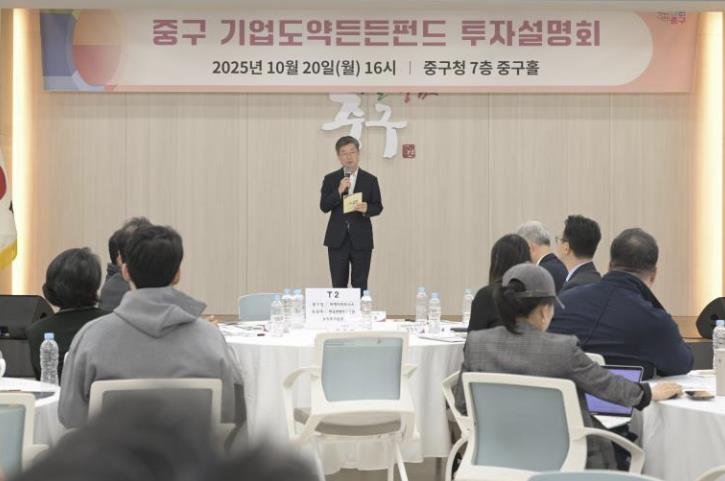 [무한뉴스=정승훈 기자] 서울 중구가 지난 20일 중구청에서 '중구 기업도약든든펀드 투자설명회'를 열고, 성장 잠재력이 높은 중소·벤처기업을 대상으로 투자 유치와 성장 지원 계획을 밝혔다.