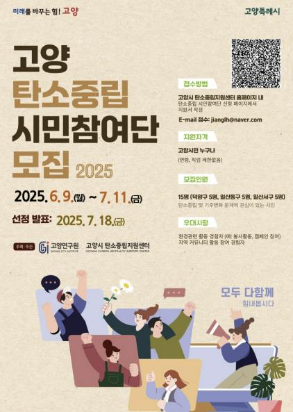 모집 기간은 6월 26일부터 7월 10일까지이며, 고양시 탄소중립 지원센터 누리집에서 신청서를 내려받아 이메일로 접수할 수 있다.(홍보포스터 QR코드 참조).