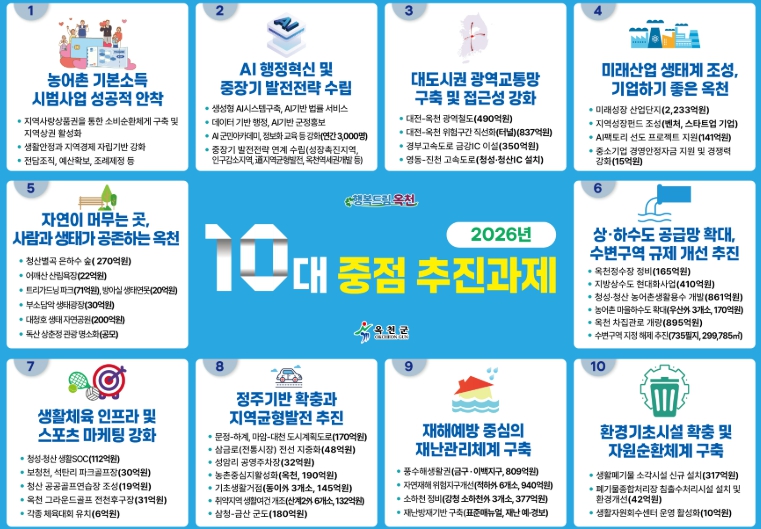 [무한뉴스=정민정 기자] 옥천군이 26일 2026년 군정 운영의 핵심 방향을 담은 10대 중점 추진과제를 발표하고, 군민 삶의 질 향상과 지속가능한 지역성장을 위한 정책 추진에 나선다.