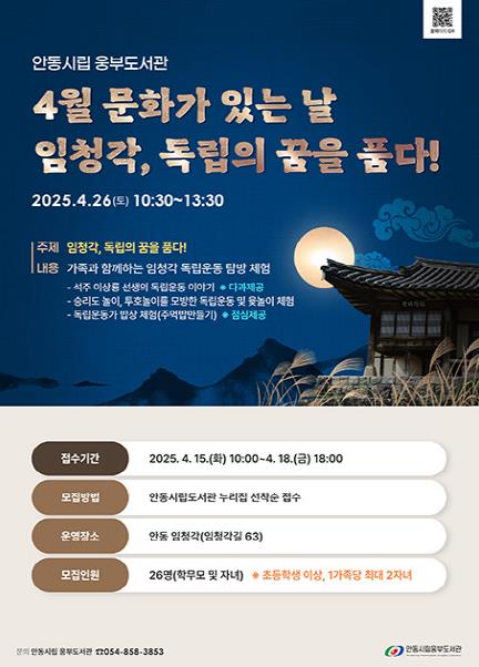 이번 행사는 ‘4월 문화가 있는 날’ 행사의 일환으로, 독립운동의 산실이자 500년 역사를 자랑하는 임청각에서 안동의 독립운동 발자취를 따라가는 가족 탐방으로 진행된다.