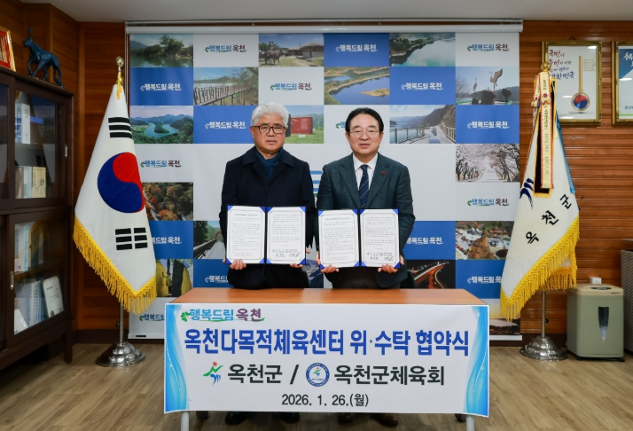 [무한뉴스=정민정 기자] 옥천군은 26일 지역 생활체육의 새로운 거점이 될 ‘옥천다목적체육센터’의 효율적인 관리와 전문적 운영을 위해 옥천군체육회(회장 이철순)와 위·수탁 협약을 체결했다고 밝혔다.
