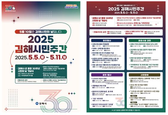 이 기간 김해시‧군 통합 30주년 기념하기 위한 기념식과 함께 민간기록물 전시회, 기념음악회, 문화나눔 가족한마당, 불꽃축제(17일) 등 통합 30주년의 의미를 담은 행사와 프로그램을 선보인다.