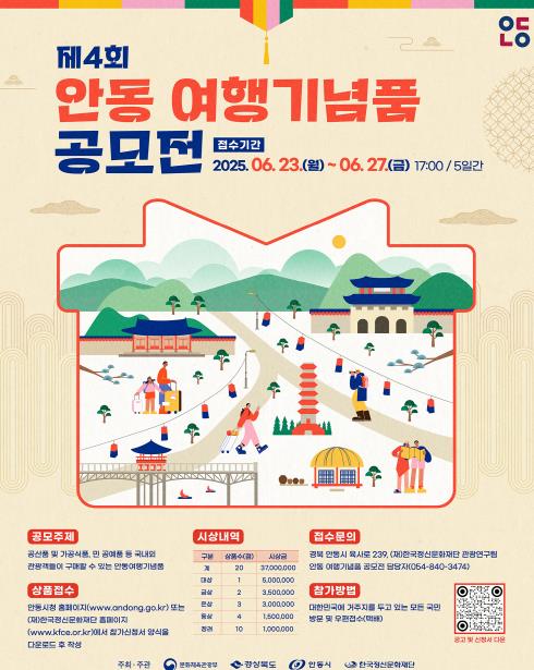 이번 공모전은 4월 21일부터 6월 27일까지 총 68일간 진행되며, 작품 접수는 6월 23일(월)부터 6월 27일(금)까지 5일간 이뤄진다. 공모전에서는 ▲안동을 대표할 수 있는 실용성 높은 관광기념품 ▲현대적 감각을 가미한 지역 특산․문화 모티브 상품 ▲축제 및 사계절 관광콘텐츠와 연계한 굿즈 등을 중심으로 창작품을 모집한다.
