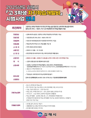 [무한뉴스=최진수 기자] 김해시는 오는 9월부터 관내 고등학교 3학년 학생들을 대상으로 학습 바우처를 지원하는 고3 학생 자기학습개발비 시범사업을 본격 추진한다고 25일 밝혔다.