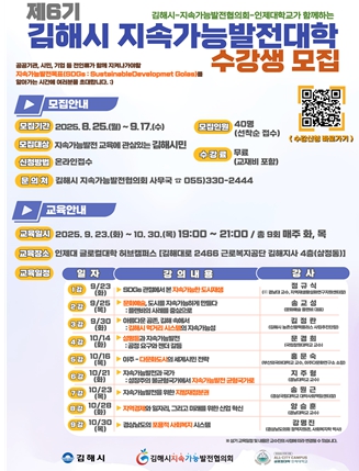 [무한뉴스=최진수 기자] 김해시는 오는 9월 23일부터 10월 30일까지 개강하는 ‘제6기 김해시 지속가능발전대학 기본과정’에 참여할 시민을 모집한다고 25일 밝혔다.