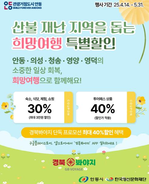 이번 기획전은 산불 피해를 입은 특별재난지역에 관광 수요를 유도해, 침체된 지역 경제에 활력을 불어넣고 지역사회의 일상 회복에 기여하고자 마련된 사업으로 4월 14일부터 5월 31일까지 진행된다.