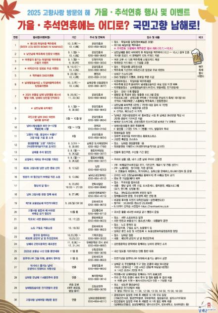 [무한뉴스=최진수 기자] 남해군은 2025년 ‘고향사랑 방문의 해’를 맞아 추석·가을 연휴 기간 군민과 관광객 모두가 즐길 수 있는 다채로운 행사와 이벤트를 마련했다고 밝혔다.