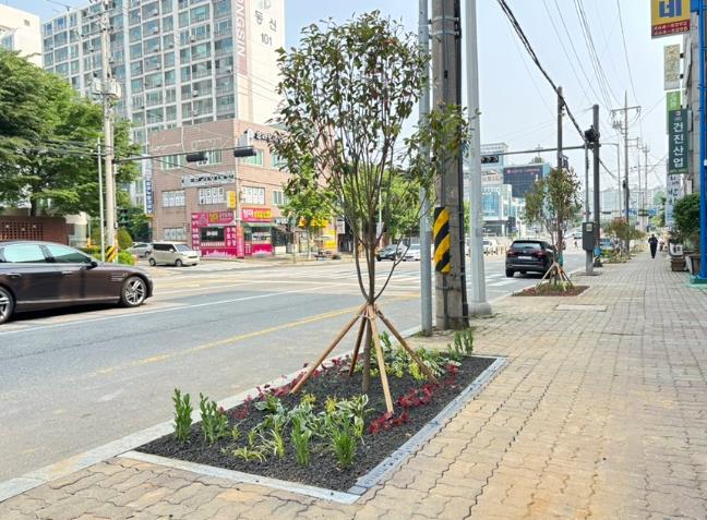 이런 의견을 반영한 시는 먼저 상가 방면의 기존 우량 가로수를 이식하고 사계절 내내 푸른 잎을 유지해 가로경관을 개선할 수 있는 상록활엽수종으로 수종을 갱신했다.