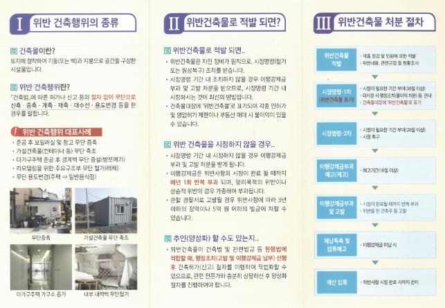 리플렛에는 위반건축물의 정의와 대표적인 위반사례, 적발 시 처분에 관한 사항 및 처분 절차, 이행강제금에 대한 내용 자세히 담고 있으며, 시민들이 어려워하는 건축법에 대한 내용을 알기 쉽게 설명하여 시민들의 이해도를 높였다.