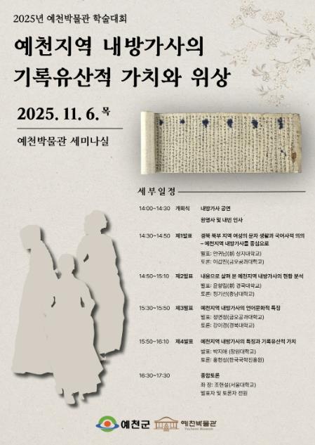 [무한뉴스=최진수 기자] 예천군 예천박물관은 11월 6일 오후 2시 ‘예천지역 내방가사의 기록유산적 가치와 위상’이란 주제로 학술대회를 개최한다.