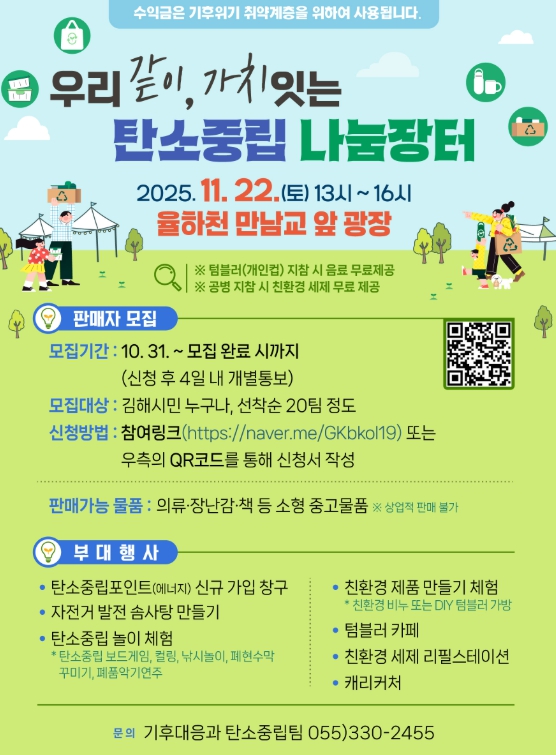 [무한뉴스=최진수 기자] 김해시는 김해시기후환경네트워크와 함께 오는 22일 율하유적전시관 앞 광장 일원에서 ‘우리 같이, 가치 잇는 탄소중립 나눔장터’를 개최한다고 20일 밝혔다.