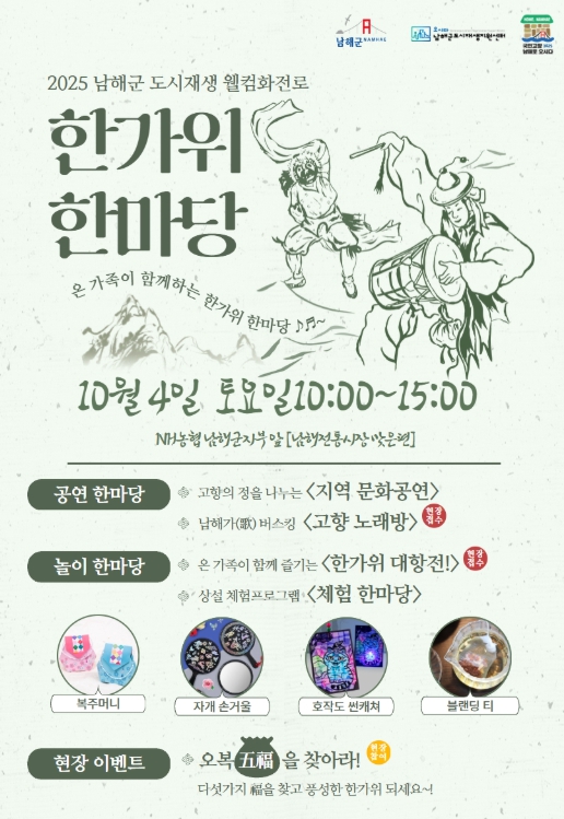 [무한뉴스=최진수 기자] 남해군도시재생지원센터는 추석연휴를 맞아 오는 10월 4일 NH농협 남해군지부 앞(전통시장 맞은편)에서 ‘한가위 한마당’ 행사를 개최한다고 밝혔다.
