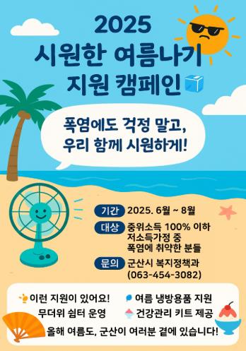 [무한뉴스=정민정 기자] 군산시는 여름철 폭염에 취약한 저소득층을 위한 ‘2025 저소득가정 건강한 여름나기 캠페인’을 진행한다고 10일 밝혔다.