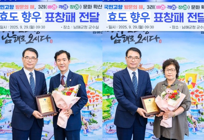 [무한뉴스=최진수 기자] 남해군은 9월 29일 군청 대회의실에서 ‘효도 향우 표창패 전달식’을 열고, 고향을 잊지 않고 부모님을 모시며 3려 문화 확산과 고향사랑 실천에 기여한 향우에게 표창패를 전달했다.