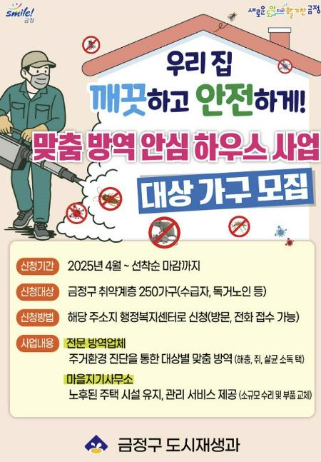 방역 대상 가구 모집은 금정구 관내 국민 기초생활수급자, 독거노인, 차상위계층을 대상으로 4월부터 선착순으로 주소지 행정복지센터를 통해 접수하고 있으며, 이와 별도로 주택 시설 유지·관리 서비스와 관련된 사항은 금정구 마을지기 사무소로 문의하면 된다.