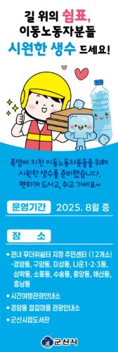이헌현 군산시 일자리경제과장은 “이동노동자는 업무 특성상 정해진 휴게시설이 없어 냉음료를 확보하기 어려운 경우가 많다”며, “무더위 속 시원한 생수 한 병이 큰 위로가 될 수 있기를 바란다”고 전했다.