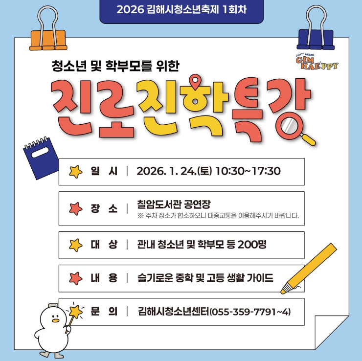 [무한뉴스=최진수 기자] 김해시청소년센터는 오는 24일 칠암도서관 공연장에서 청소년과 학부모를 위한 ‘2026 청소년 진로·진학특강’을 개최한다고