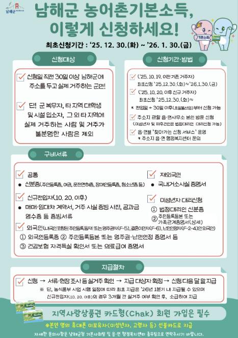 [무한뉴스=최진수 기자] 남해군은 ‘농어촌 기본소득 시범사업’ 신청 접수를 오는 12월 30일부터 2026년 1월 30일까지 실시한다고 밝혔다.