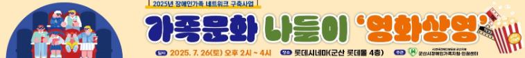 이번 행사는 군산시에 거주하는 장애인 가족, 지역주민, 자원봉사자 등 100여 명을 대상으로 7월 26일 오후 두 시부터 군산 롯데몰 4층 롯데시네마에서 진행될 예정이다.