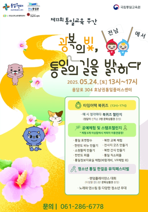 김진선 호남권 통일+센터장은 “제13회 통일교육주간을 맞아 도민이 통일과 광복에 대해 고민하고, 평화와 통일에 더 많은 관심을 갖게 되길 기대한다”고 말했다.