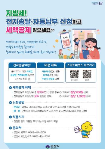 군산시 장영호 세무과장은 “전자송달 및 자동이체를 신청하면 세제 혜택도 누리고, 종이 고지서 분실과 납기 경과에 따른 가산세 불이익을 사전에 방지할 수 있다. 시민들이 많이 신청할 수 있도록 시에서도 적극 홍보하겠다.”라고 전했다.