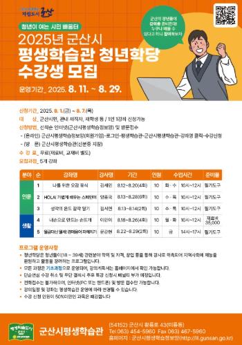 [무한뉴스=정민정 기자] 군산시평생학습관이 청년 강사들과 함께 지역사회에 활력을 불어넣는 ‘2025년 청년학당 프로그램’을 오는 8월 11일부터 8월 29일까지 운영한다.