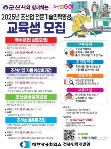 이번 조선업 전문 기술 인력 양성 교육은 전북인력개발원(군산시 동장산로 119, 소룡동)에서 진행되며 취업을 희망하는 미취업자 누구나 신청할 수 있다.