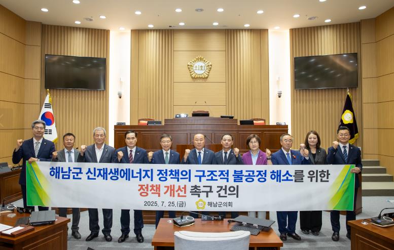 [무한뉴스=정민정 기자] 해남군의회는 지난 25일 열린 제345회 임시회에서 서해근 의원이 대표 발의한 '해남군 신재생에너지 정책의 구조적 불공정 해소를 위한 정책 개선 촉구 건의안'을 채택하고, 신재생에너지 발전의 혜택이 지역민에게 실질적으로 돌아갈 수 있도록 제도 개선을 정부와 한국전력공사에 강력히 촉구했다.
