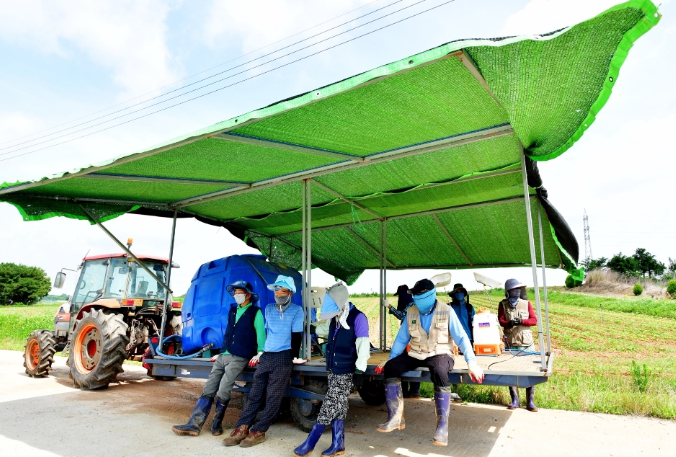트레일러 위에는 그늘막과 간이 의자, 수분 보충용 음료 등을 탑재해 농작업 장소까지 이동하도록 구성됐다.