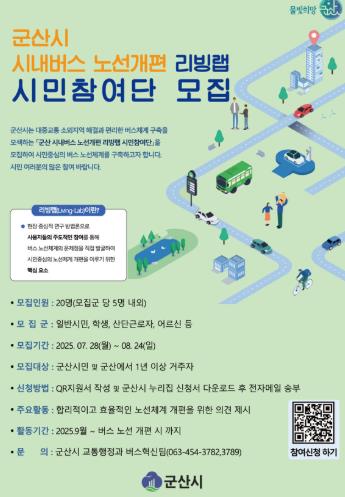 [무한뉴스=정민정 기자] 군산시가 시내버스 노선체계 개편을 앞두고 시민이 직접 참여해 문제를 진단하고 개선방안을 도출하는 ‘시내버스 노선개편 리빙랩 시민참여단’을 모집한다.