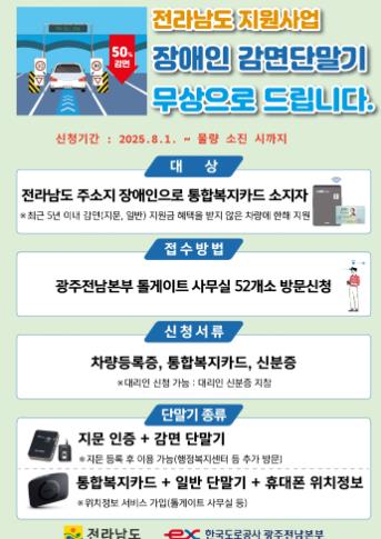신청은 장애인 통합복지카드, 자동차 등록증과 신분증을 준비해 한국도로공사 광주전남본부 52개 톨게이트 영업소에 직접 방문해 하면 된다.