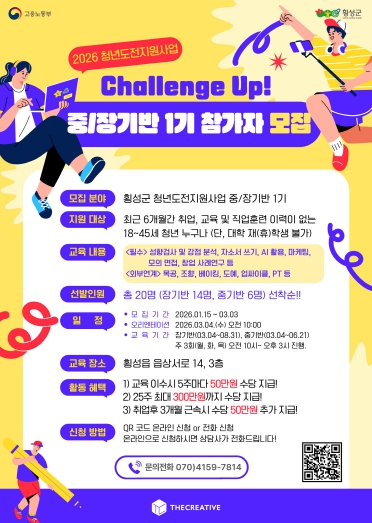 [무한뉴스=정민정 기자] 횡성군은 지역 청년들의 사회 진출과 성장을 지원하기 위해 ‘2026 청년도전지원사업’ 참여자를 모집한다고 밝혔다.
