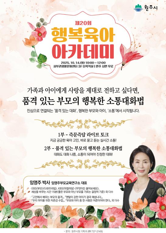 [무한뉴스=정민정 기자] 원주시는 10월 14일 오전 10시, 서원주생활문화센터 3층 임영주 임영주부모교육연구소 대표와 함께 ‘제20회 행복육아 아카데미’를 개최한다.