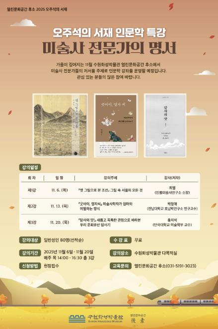 [무한뉴스=양현명 기자] 수원화성박물관 열린문화공간 후소가 11월 6일부터 20일까지 매주 목요일 오후 2시 ‘오주석의 서재 인문학 특강–미술사 전문가의 명서’를 연다.