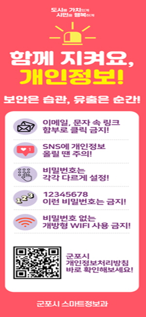 [무한뉴스=손성기 기자] 군포시는 9월 30일 ‘개인정보 보호의 날’을 맞아 시민들의 개인정보 보호 인식을 높이고 생활 속 보호 문화를 확산하기 위해 ‘2025년 개인정보 보호의 날 기념 캠페인’을 9월 24일부터 10월 2일까지 추진한다.