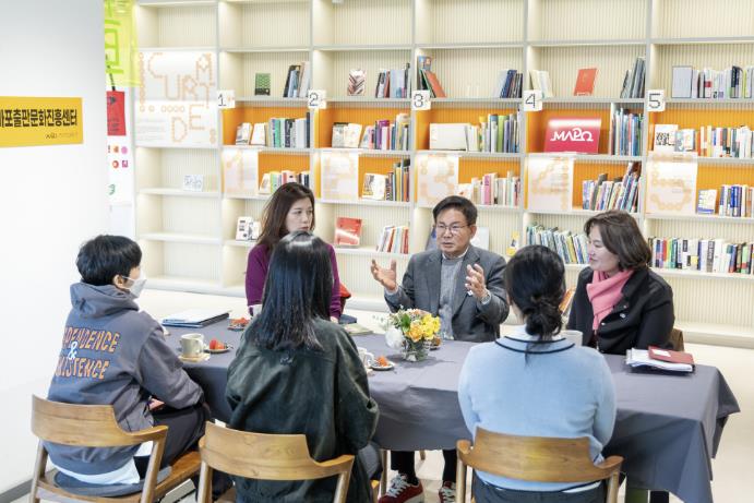 차담회에는 박강수 마포구청장과 민지형 작가, 차영지 대표, 홍경화 대표, 최진영 센터장 등이 참석했다.