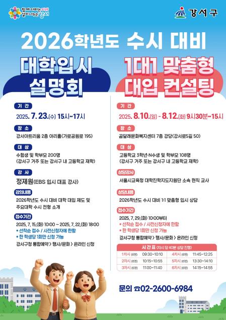 [무한뉴스=정승훈 기자] 서울 강서구는 2026학년도 수시 대비를 위해 ‘대학입시 설명회’와 ‘1대1 맞춤형 대입 컨설팅’을 개최한다.