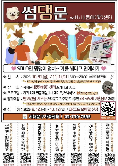 [무한뉴스=정승훈 기자] 서대문구는 서대문구가족센터가 10월 31일과 11월 1일 서대문 내품애(愛)센터(모래내로 333)에서 반려견을 키우는 미혼남녀 만남 행사 ‘썸댕문 with 내품애센터’를 개최한다고 17일 밝혔다.