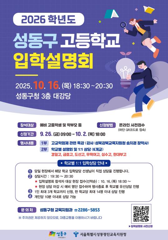 설명회는 ▲ 1부 고교 진학 대비 특강(강사: 성북강북교육지원청 송치경 장학사) ▲ 2부 성동구 학교별 입학설명회 및 1:1 상담(경일고, 금호고, 도선고, 무학여고, 성수고, 한대부고)으로 진행된다.