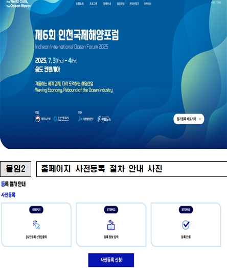 [무한뉴스=정승훈 기자] 인천광역시는 오는 7월 3일부터 4일까지 이틀간 송도컨벤시아에서 개최되는 ‘제6회 인천국제해양포럼(Incheon International Ocean Forum 2025)’의 사전등록을 5월 2일부터 6월 30일까지 포럼 공식 누리집을 통해 진행한다고 밝혔다.
