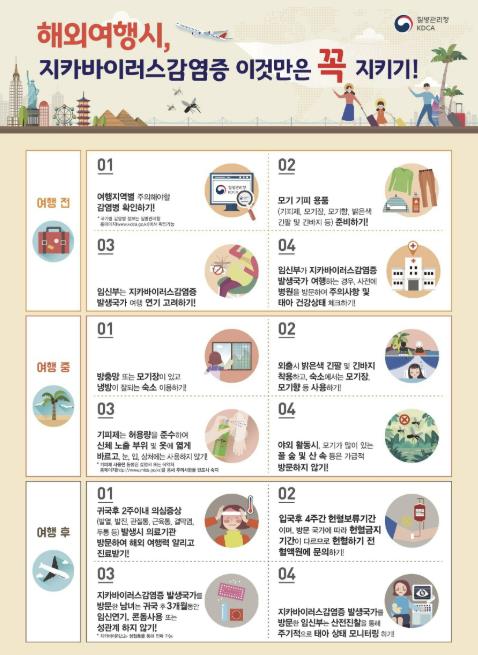 특히, 시는 미주와 동남아시아, 서태평양, 아프리카, 유럽 등 92개 국가가 지카바이러스 위험국가인 만큼 관련 국가를 방문할 때 ▲풀숲 및 산속 피하기 ▲밝은색 긴 옷 착용하기 ▲모기기피제 사용하기 ▲모기장 사용하기 등의 예방 수칙을 준수할 것을 당부했다.