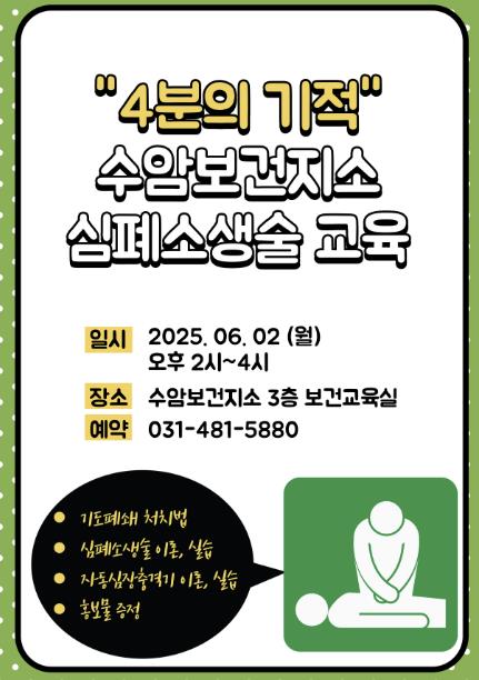[무한뉴스=정승훈 기자] 안산시 상록수보건소 수암보건지소는 다음달 2일 주민들의 응급상황 대처 능력 향상을 위한 ‘4분의 기적’ 상반기 심폐소생술 교육을 진행한다고 22일 밝혔다.