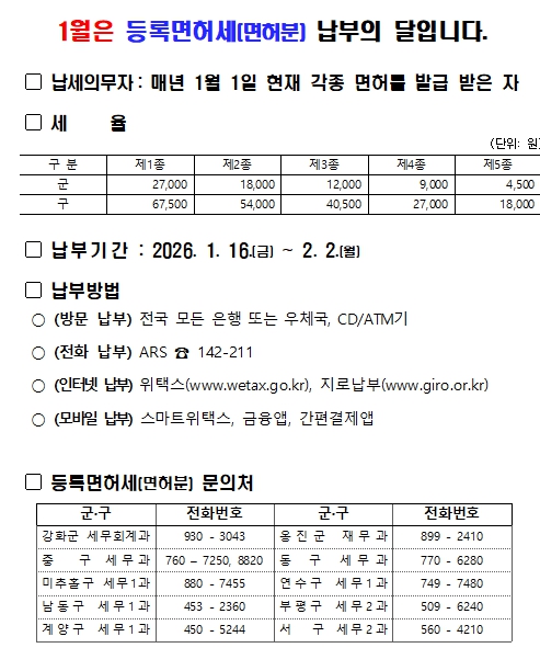 [무한뉴스=정승훈 기자] 인천광역시는 2026년 정기분 등록면허세(면허분) 396,262건,총128억 원을 부과·고지했다고 밝혔다.