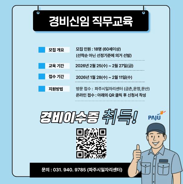 [무한뉴스=정승훈 기자] 파주시는 경비 분야 취업을 희망하는 시민을 대상으로 ‘경비 신임 직무교육’참여자 18명을 모집한다.