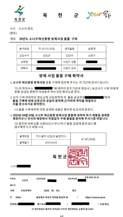 또한 이와 유사한 의심스러운 요청을 받았을 경우, 반드시 옥천군 행정팀으로 연락해 해당 부서 주무관의 실명 및 연락처를 확인할 것을 당부했다.