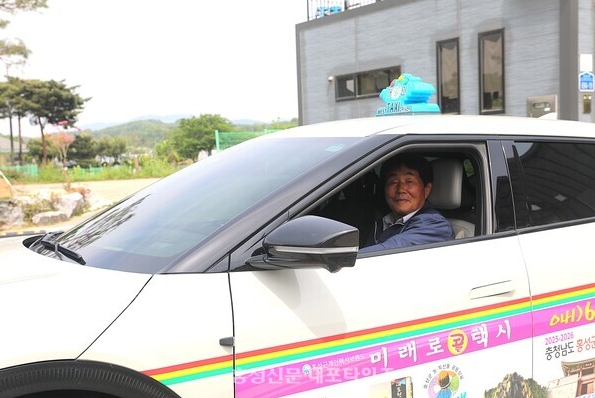 ▲ 홍동면에서 김양구 기사와 함께 ‘수요일만 마을택시’를 운영하고 있는 모습(충남사회서비스원 제공)