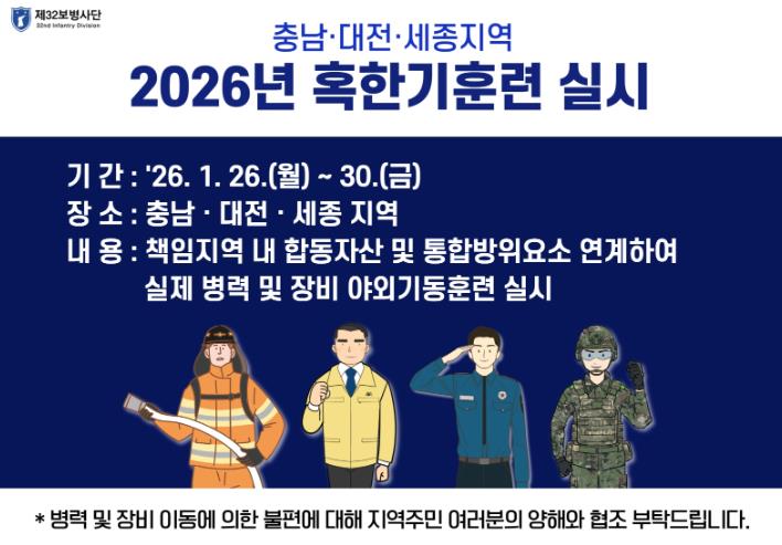 [무한뉴스=정민정 기자] 육군 제32보병사단은 오는 1월 26일부터 30일까지 충남ㆍ대전ㆍ세종 지역에서 동계 통합 방위 작전 확립을 위한 혹한기 훈련을 진행한다.