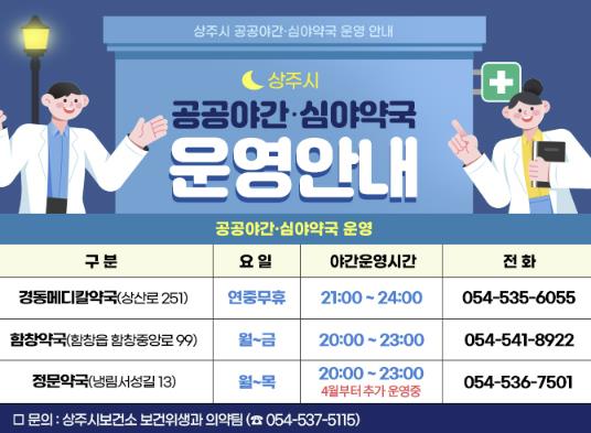 공공야간·심야약국 관련 정보는 상주시청 홈페이지 또는 상주시 보건소를 통해 확인할 수 있다.